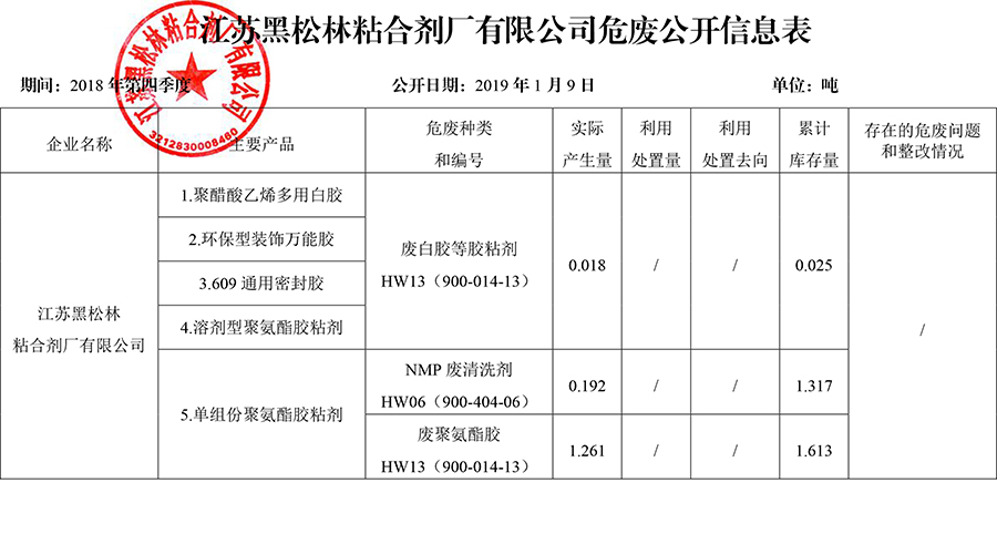 2018年度第四季度江苏黑松林粘合剂厂有限公司危废公开信息表