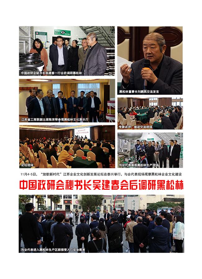 论坛结束后,在江苏省政研会秘书长廖炬先、江苏省委宣传部二级调研员沈霆,以及江苏工人报活动专题部主任唐和平等人的陪同下,中国政研会秘书长吴建春、办公室主任陈笑雪、办公室干部邓凯一行对江苏黑松林粘合剂厂有限公司进行了调研。吴建春对黑松林企业文化建设取得的成果给予了充分的肯定。 |