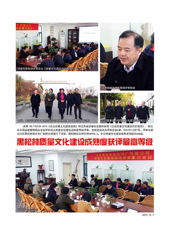 “经过评审专家组1天的评审,我宣布,江苏黑松林粘合剂厂有限公司质量文化建设综合评价得分940.5,企业质量文化建设成熟度等级为AAA级!”在江苏黑松林粘合剂厂有限公司企业文化建设现场评审末次会议上,专家组组长刘立生郑重宣布。