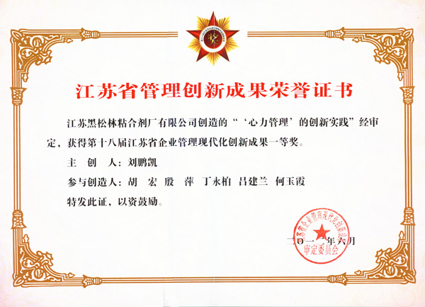 大会发布了第十八届江苏省企业管理现代化创新获奖成果。江苏黑松林粘合剂厂有限公司董事长、总经理刘鹏凯主创的“心力管理的创新实践”被审定为一等奖。这是该成果继中化党建及思想政治工作优秀研究成果一等奖、泰兴市社科成果一等奖、全国企业文化科研成果一等奖后获得的又一殊荣。南京师范大学商学院院长、博导蒋伏心教授点评认为:心力管理深化了从“物本管理”到“人本管理”的进步,包含着用心管理和用力管理相结合的丰富内涵,力求将有形力量与无形力量相结合,软实力与硬实力相结合,管理制度和管理文化相结合,关注伦理,关注人,暗含着管理伦理的新思考。