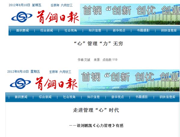 | 《首钢日报》最近刊登了两则学《心力管理》的评论文章,现全文摘录如下:
