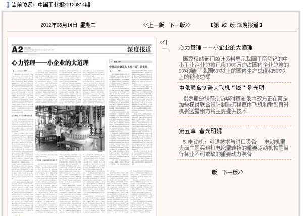 | 8月14日,中国工业报第二版深度报道版面刊登了《心力管理——小企业的大道理》。该报道从心力管理的概念、起源、对中小企业的借鉴意义入手,重点介绍了心力管理在黑松林的应用和取得的效果。现全文转载如下: