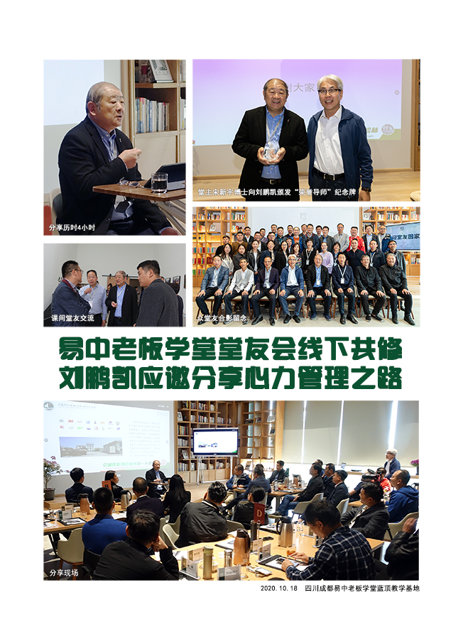 1019日下午,应易中创业(北京)管理技术服务有限公司邀请,刘鹏凯来到老板学堂成都蓝顶教学基地,为易中老板学堂堂友会线下共修的三十多位企业老板和十多位企业高管分享了他的心力管理之路。
